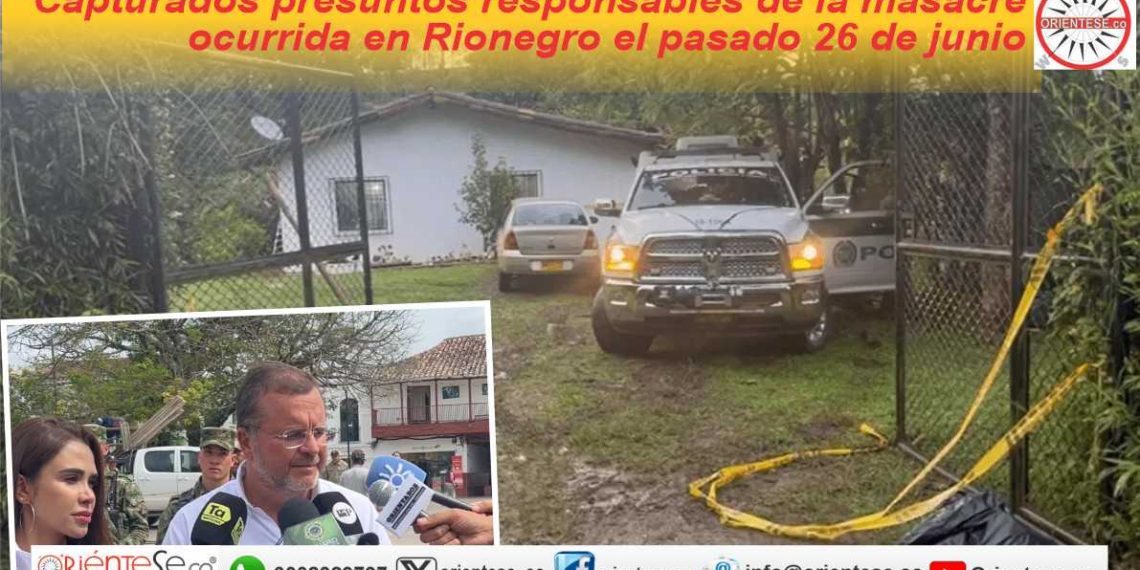 Mucha atención que el Alcalde de Rionegro confirmó esta mañana que luego de un trabajo articulado entre el Gobierno Nacional, la Fuerza Pública y los entes de esclarecimiento del delito, permitieron detener a los presuntos responsables de la masacre ocurrida el pasado 26 de junio en en la vereda Cabeceras, sector El Hoyito del municipio de Rionegro.