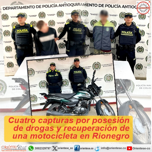 El domingo pasado, la Policía capturó en diferentes puntos de Rionegro a cuatro hombres por el delito de tráfico, fabricación o porte de estupefacientes, descritos de la siguiente manera: