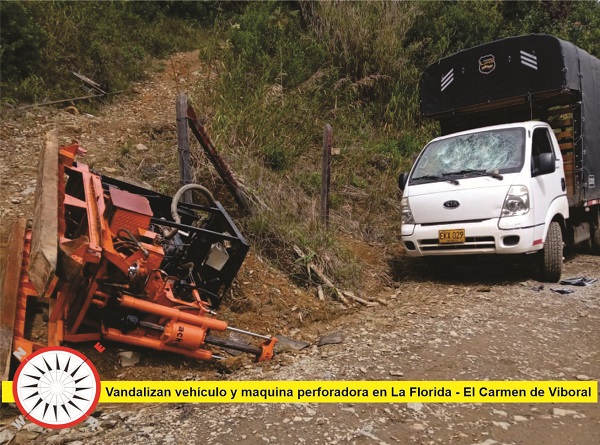 En los hechos, un vehículo camión, tipo estaca, fue atacado a piedra, causándole entre otros, daños en su vidrio panorámico y una máquina de perforación, fue volteada, generando algunos daños a su funcionamiento.