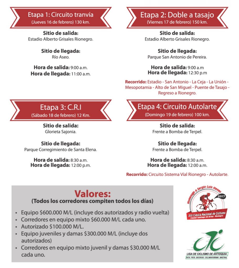 El evento programado en el calendario nacional de la disciplina y avalado por la Liga Antioqueña de Ciclismo, contará con la participación de ciclistas élite-sub 23, juvenil varones y juvenil femenino, rodará en cuatro etapas que se recorrerán por varios municipios del Oriente antioqueño, teniendo 2 circuitos de 130 y 100 kms, 1 contra reloj individual de 12 Kms y 1 etapa de ruta de 150 Kms de recorrido. (Ver etapas)