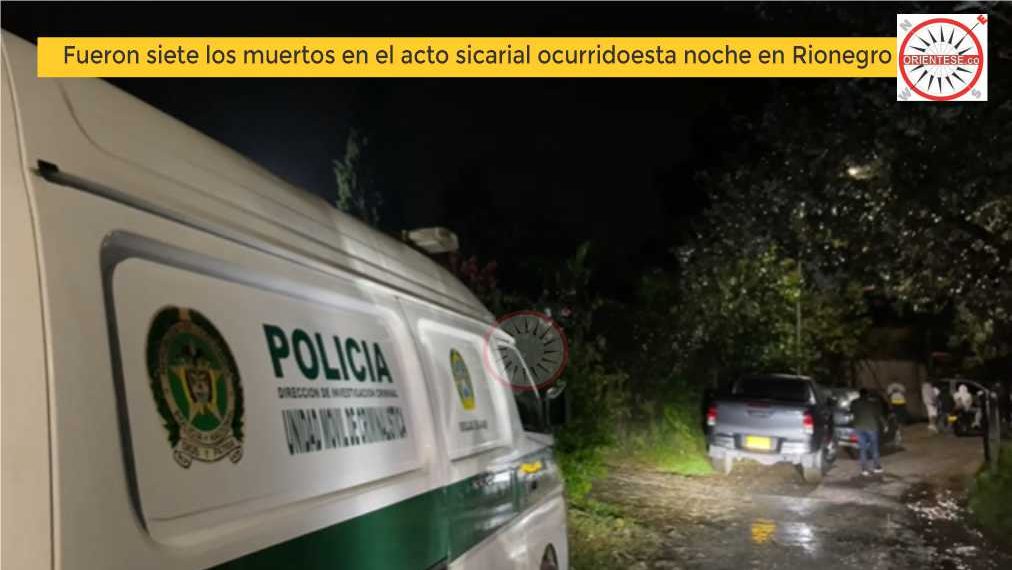 El Coronel Carlos Andrés Martínez Romero, Comandante del Departamento de Policía Antioquia, confirmó que fueron siete las personas asesinadas esta noche en el municipio de Rionegro, vereda Cabeceras, sector El Hoyito, cuando unos 10 hombres armados ingresaron a una finca y arremetieron contra estas personas.