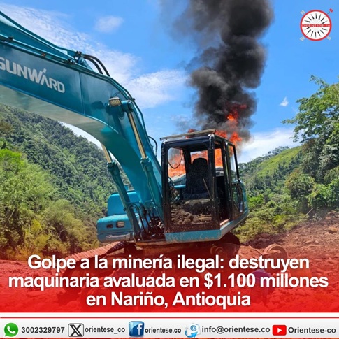 Durante la intervención fueron destruidas dos retroexcavadoras, un motor diésel tipo chorriador y una clasificadora, equipos utilizados para la extracción ilegal de minerales y que, según las autoridades, estarían vinculados al financiamiento del Clan del Golfo, subestructura “Gener Morales”.