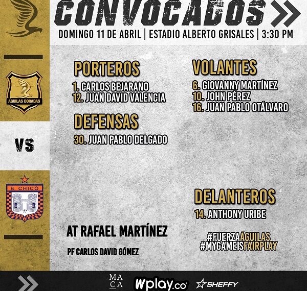 El cuerpo técnico que hay disponible para este encuentro ya anunció cuales son los siete convocados, entre ellos están los dos porteros, Carlos Bejarano y Juan David Valencia, un solo defensa, Juan Pablo Delgado, tres volantes Giovanny Martínez, John Pérez y Juan Pablo Otálvaro, y un solo delantero, Anthony Uribe.