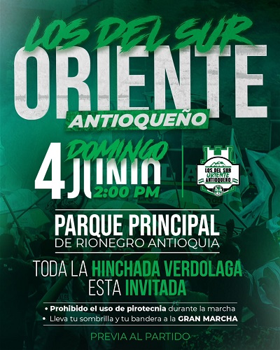 El «gran banderazo los del Sur Oriente Antioqueño», como han denominado este encuentro, será desde las 2:00 p.m. en el parque principal, con la invitación especial y abierta a todos los hinchas para que lleguen con banderas y sombrilla y hagan en la antesala del partido toda una fiesta verdolaga.