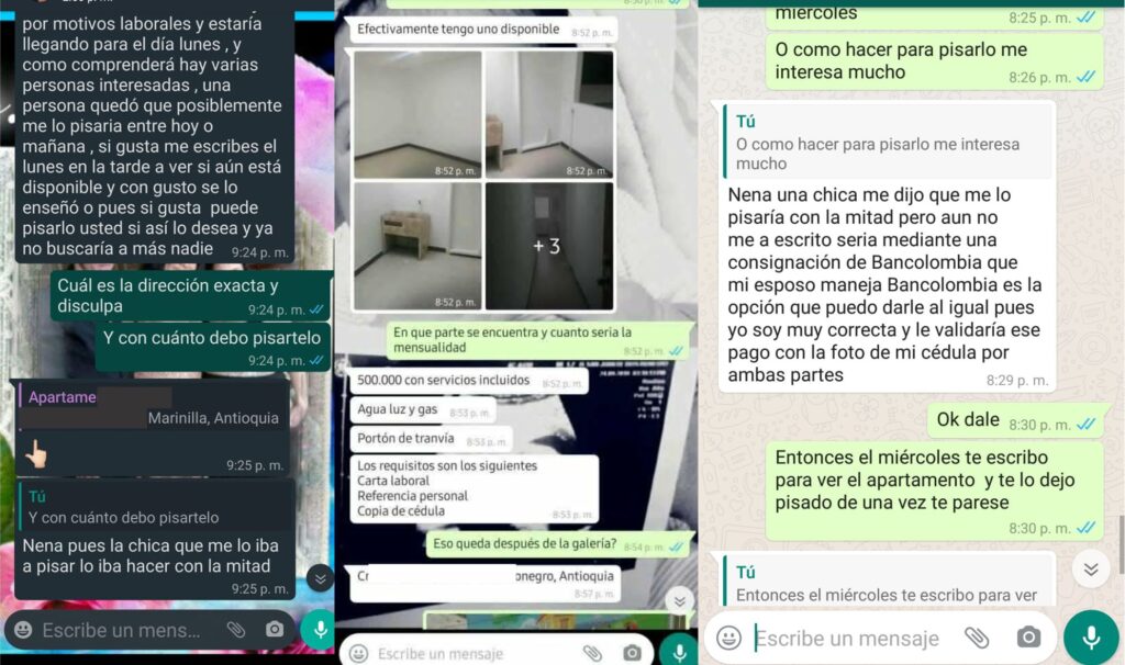 Pero esta historia no es la única que se ha evidenciado en redes. Ya han sido muchas las personas que han hecho sus publicaciones donde aparte de decir que es en Rionegro o Marinilla, cuentan exactamente lo mismo, la disponibilidad del apartamento por parte de una amiga, las comodidades, el valor, las condiciones, el viaje, y la priorización de a quien le consigne el dinero.